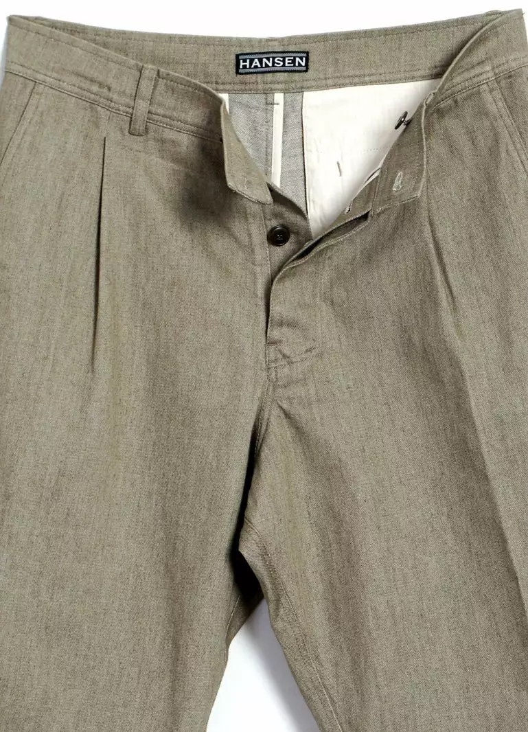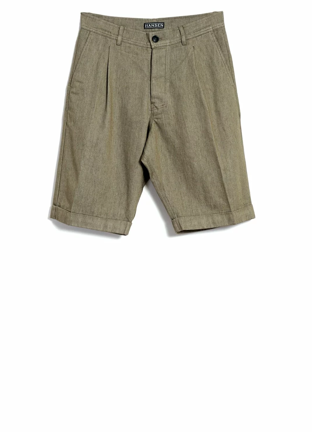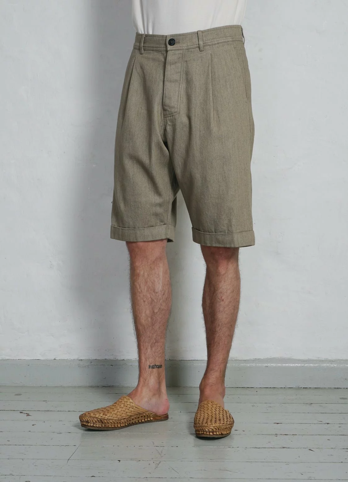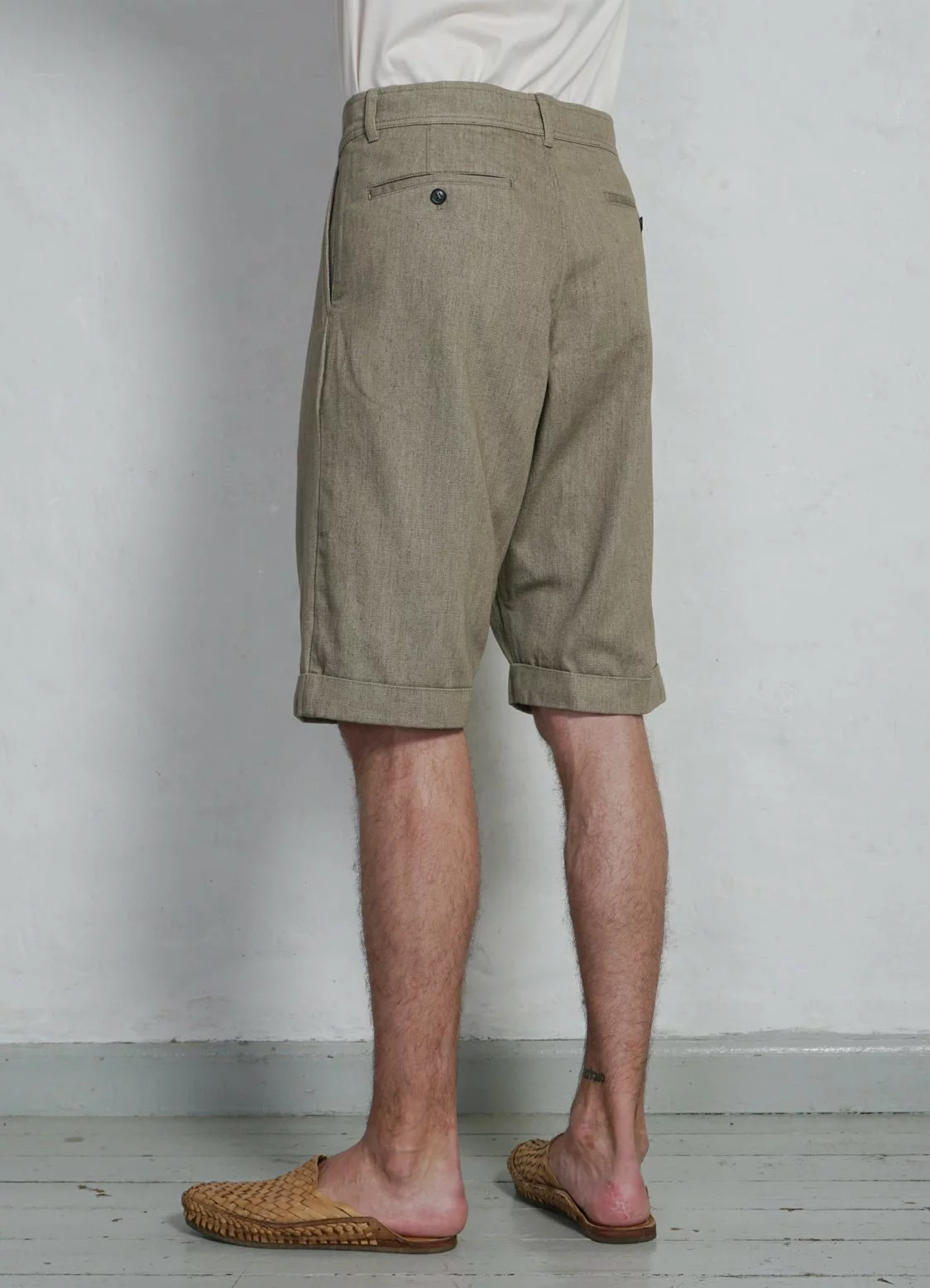 BIRK is a wide, single-pleated pair of shorts with a folded hem and slanted front pockets and two welted back pockets.