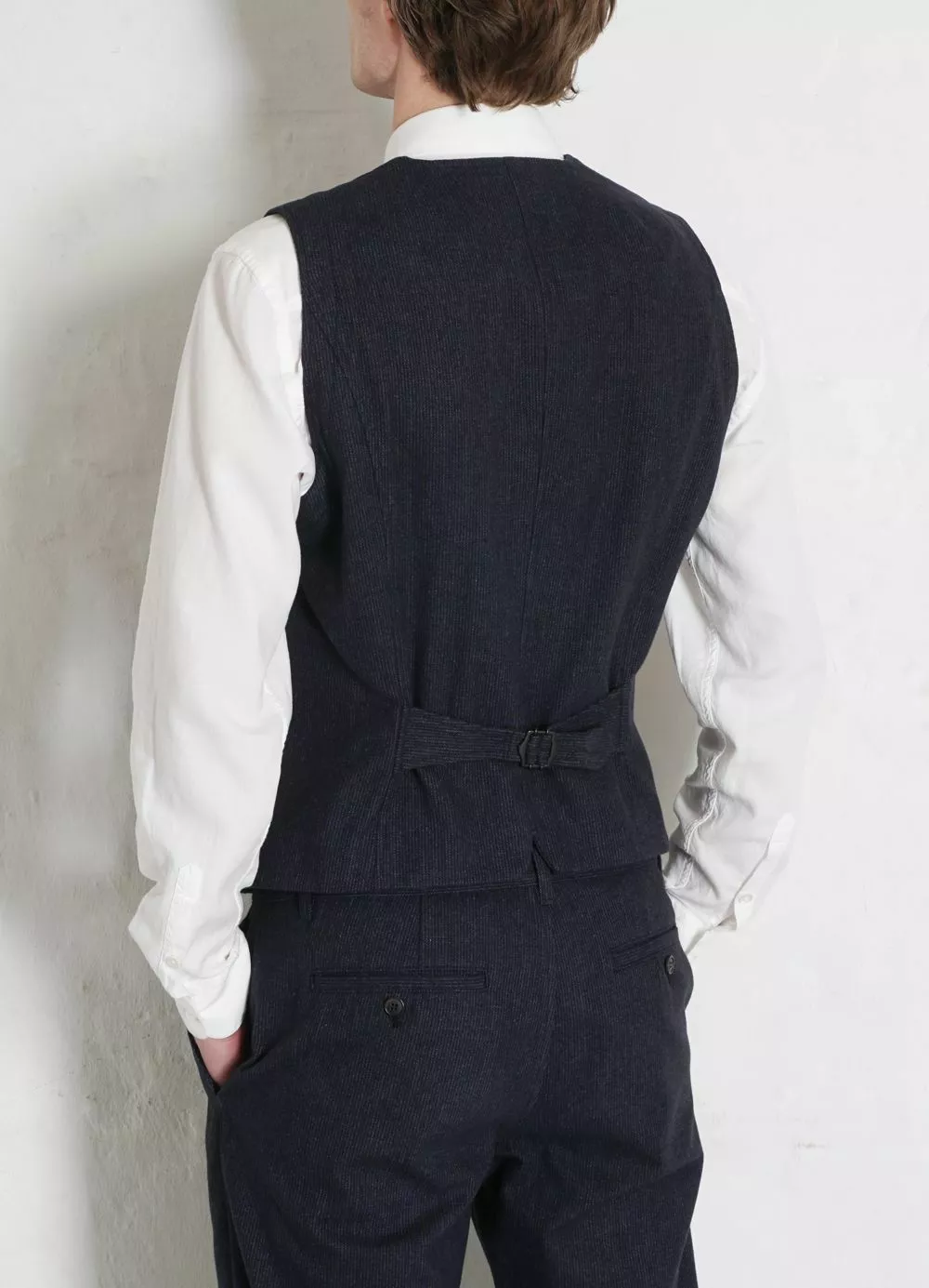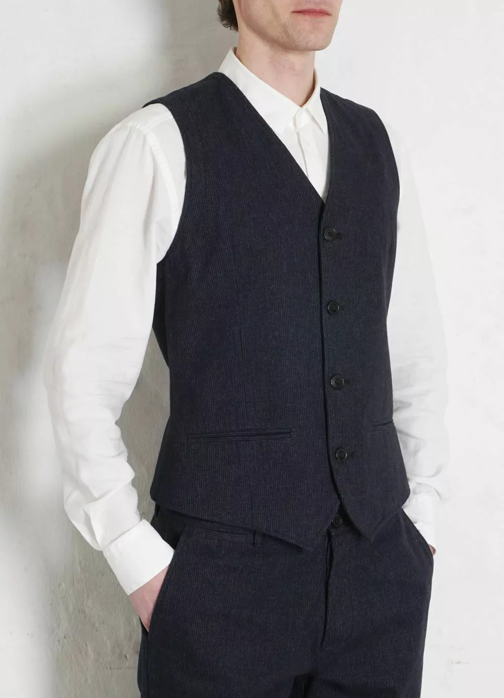 The 100% cotton fabric is yarn dyed, recycled and brushed. The yarns contain 30% recycled cotton fibres and comes with a brushed finish on both sides making it really soft and comfy to wear. The warp is set up with switching shades of blue pigment dyed yarns creating a nice uneven monochrome dark blue scaled small striped pattern.
