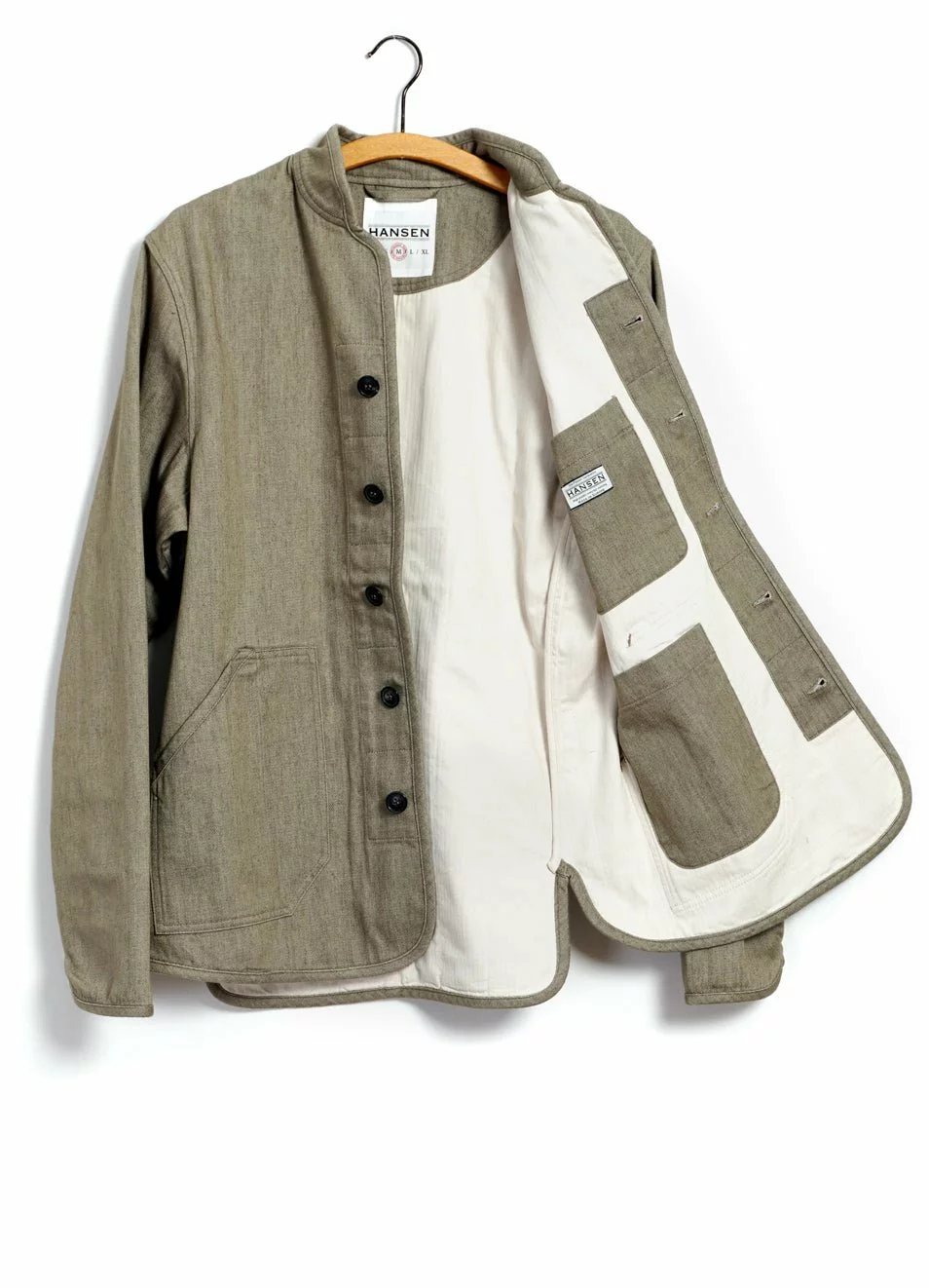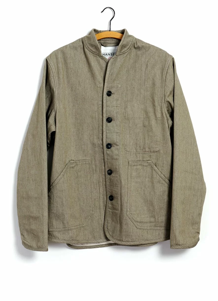 ERLING is a HANSEN signature item. It is a work wear-inspired jacket and it is quilted with a striped cotton/polyester herringbone lining. The stripes are polyester yarns and stay blue after the garment dye and creates this nice effect on the jackets inside.