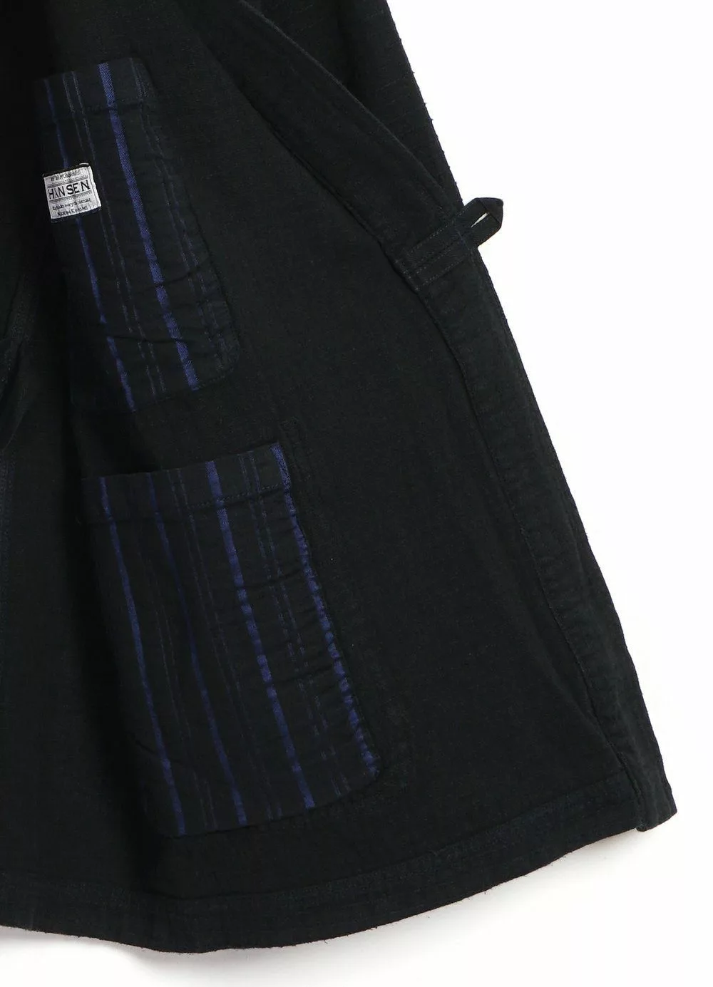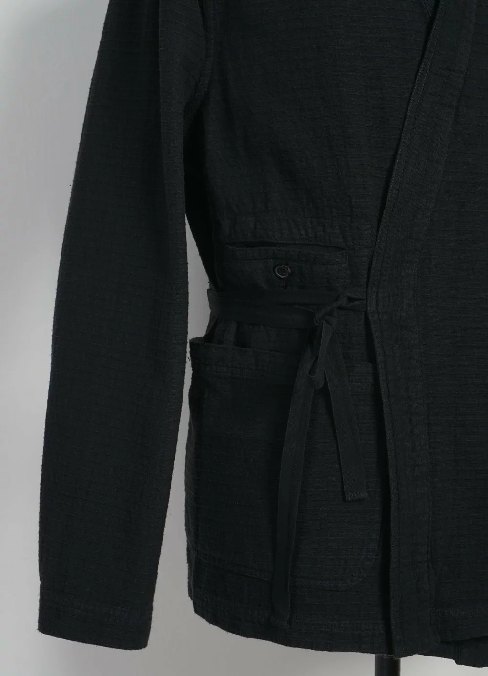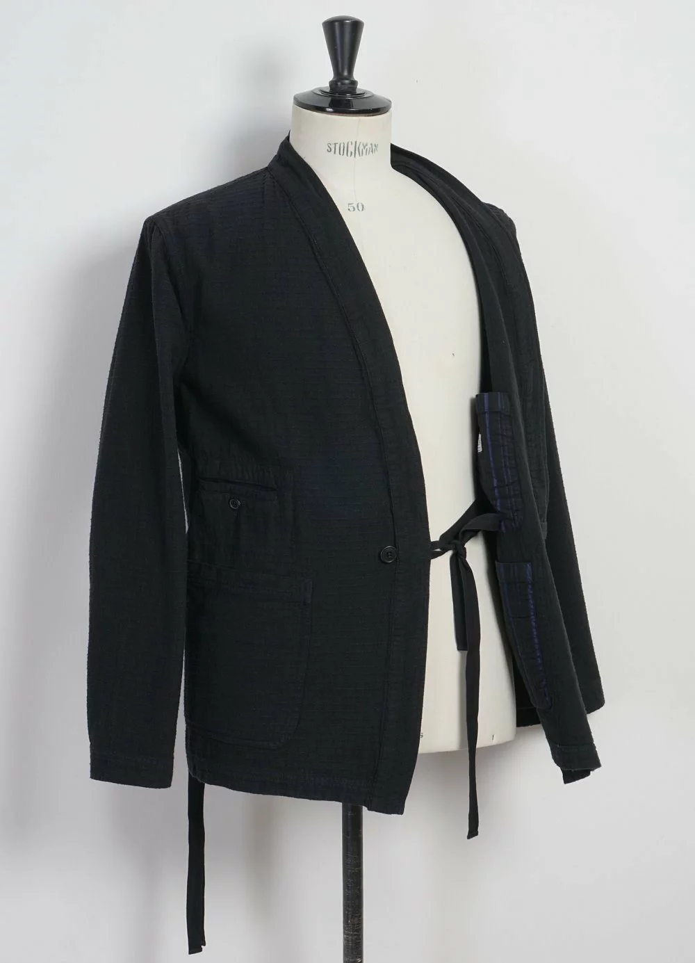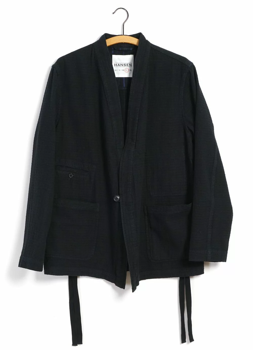 FOLKE is a newcomer for the SS21 season. It is a loose fitting kimono-styled jacket that can be closed in several ways. There are two flat-string loops, one for each side of the kimono; also there is the option to close the front part with a button. Besides that is has two big front patched-on pockets, one smaller welted front pocket, two inner