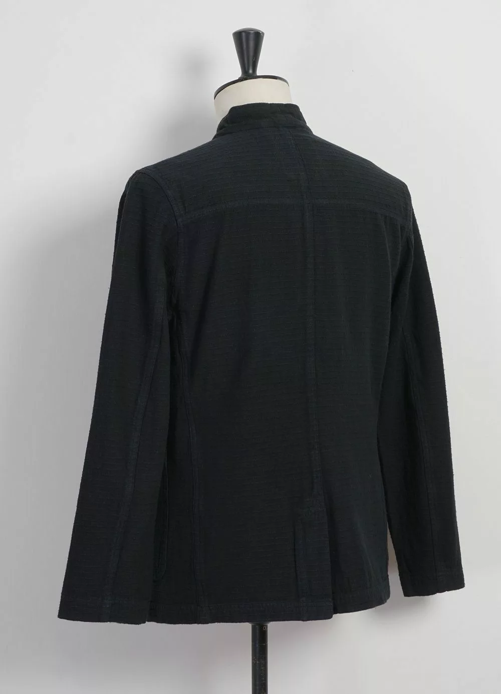 The Italian cotton blend is a lancé, which is an old and particular weaving construction, that gives the effect of hand stitched details on the surface. On one side differing stripes appear; on the other side, small dots appear. The fabric’s construction makes for a quite thick yet airy and light feeling.