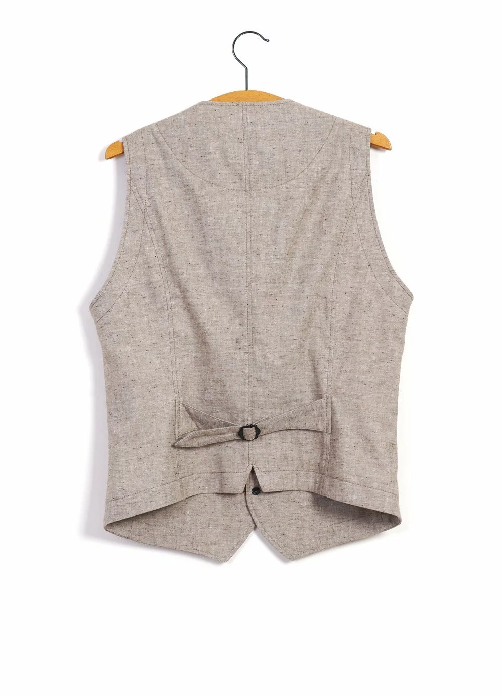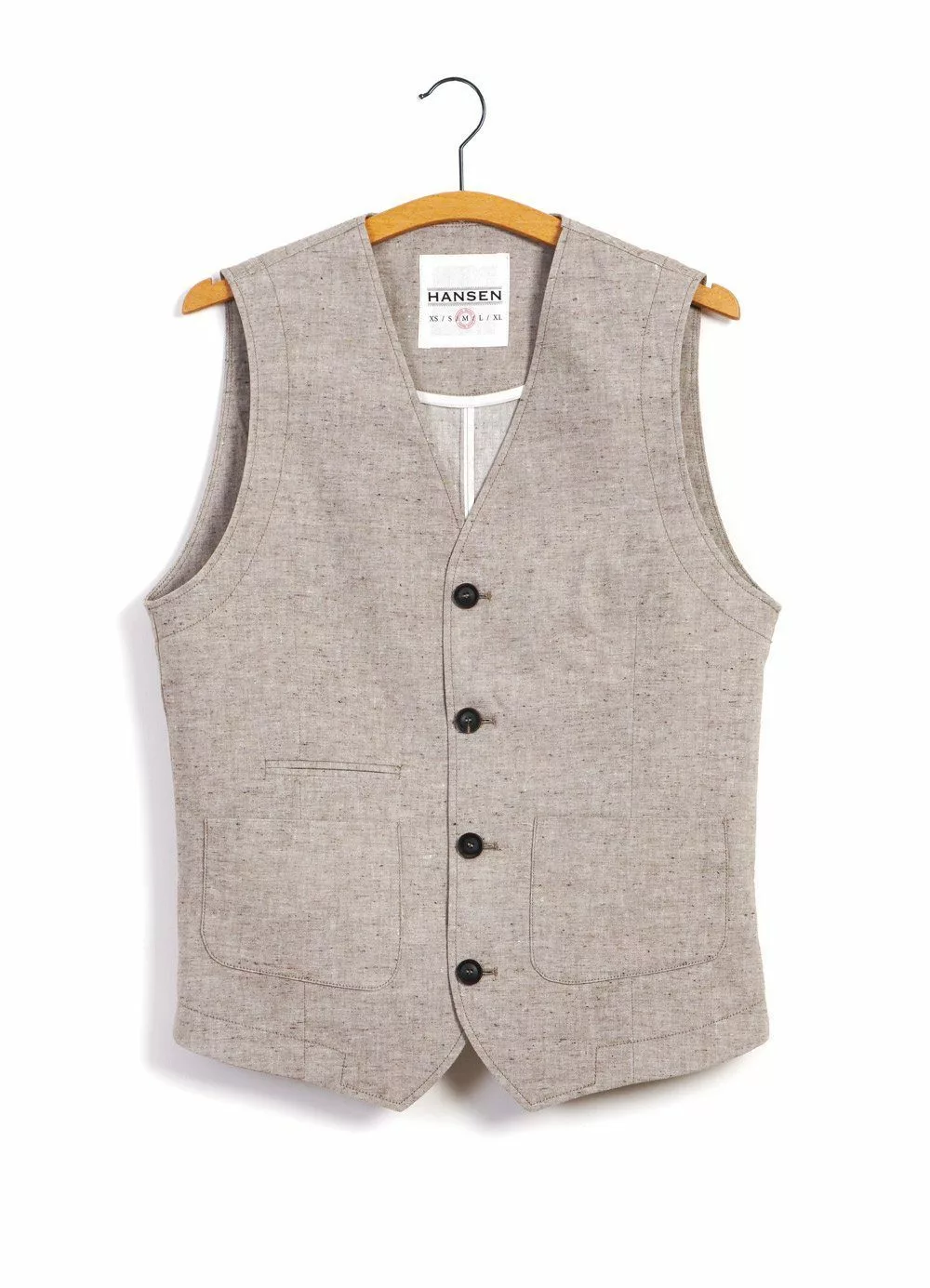 HALFDAN is a newcomer for the SS21 season. It is a 4-button waistcoat with a regular neck drop, buckle size-regulators on the back, two patched-on pockets and a welted pocket on the front.