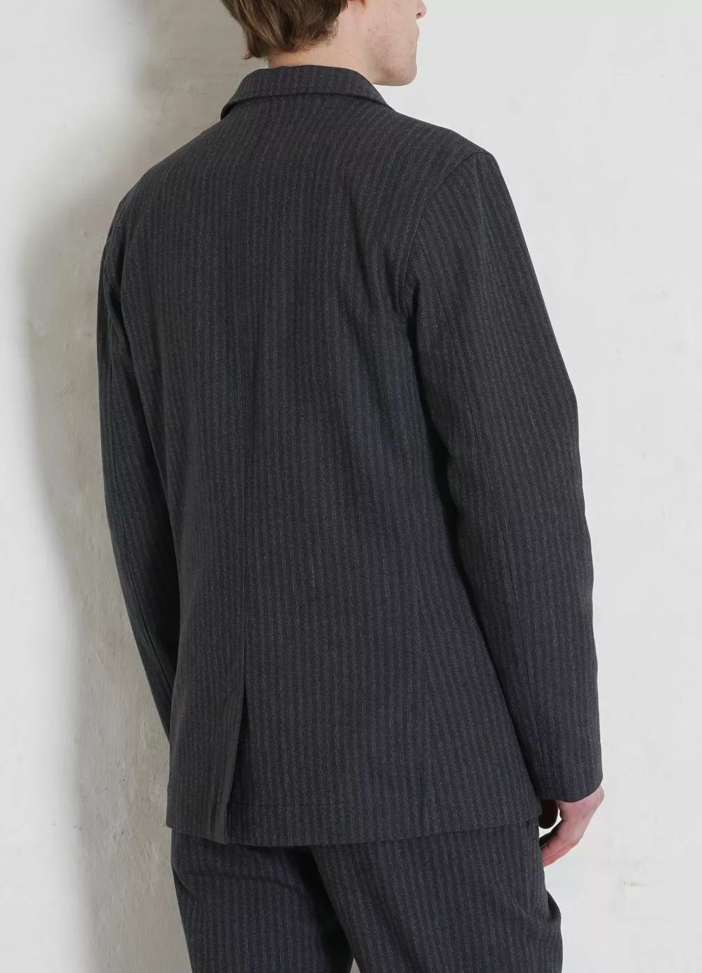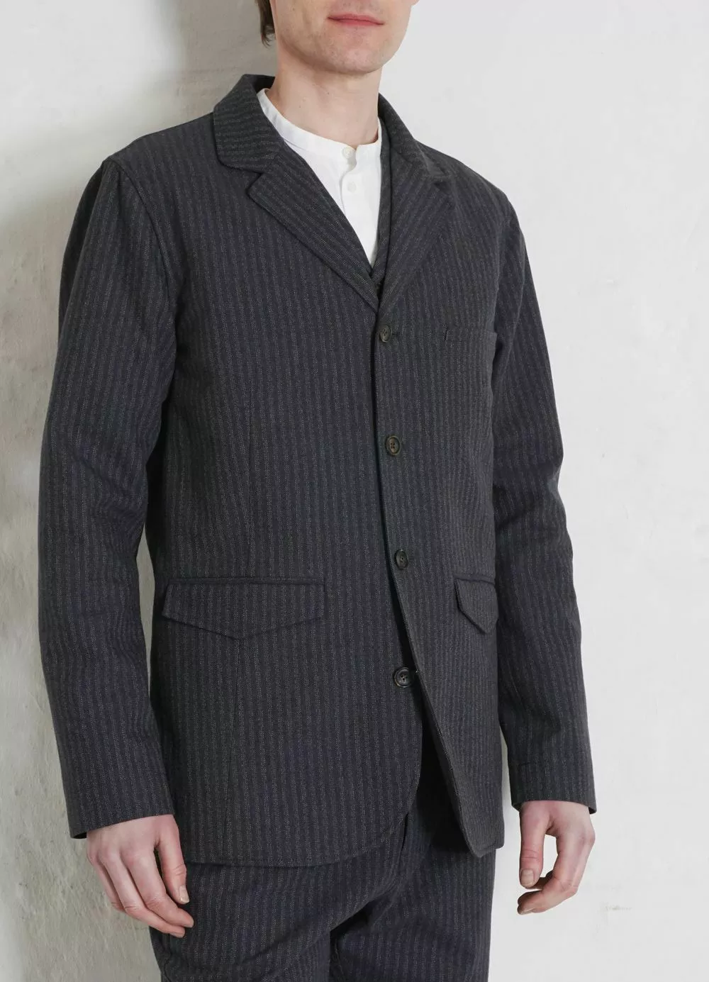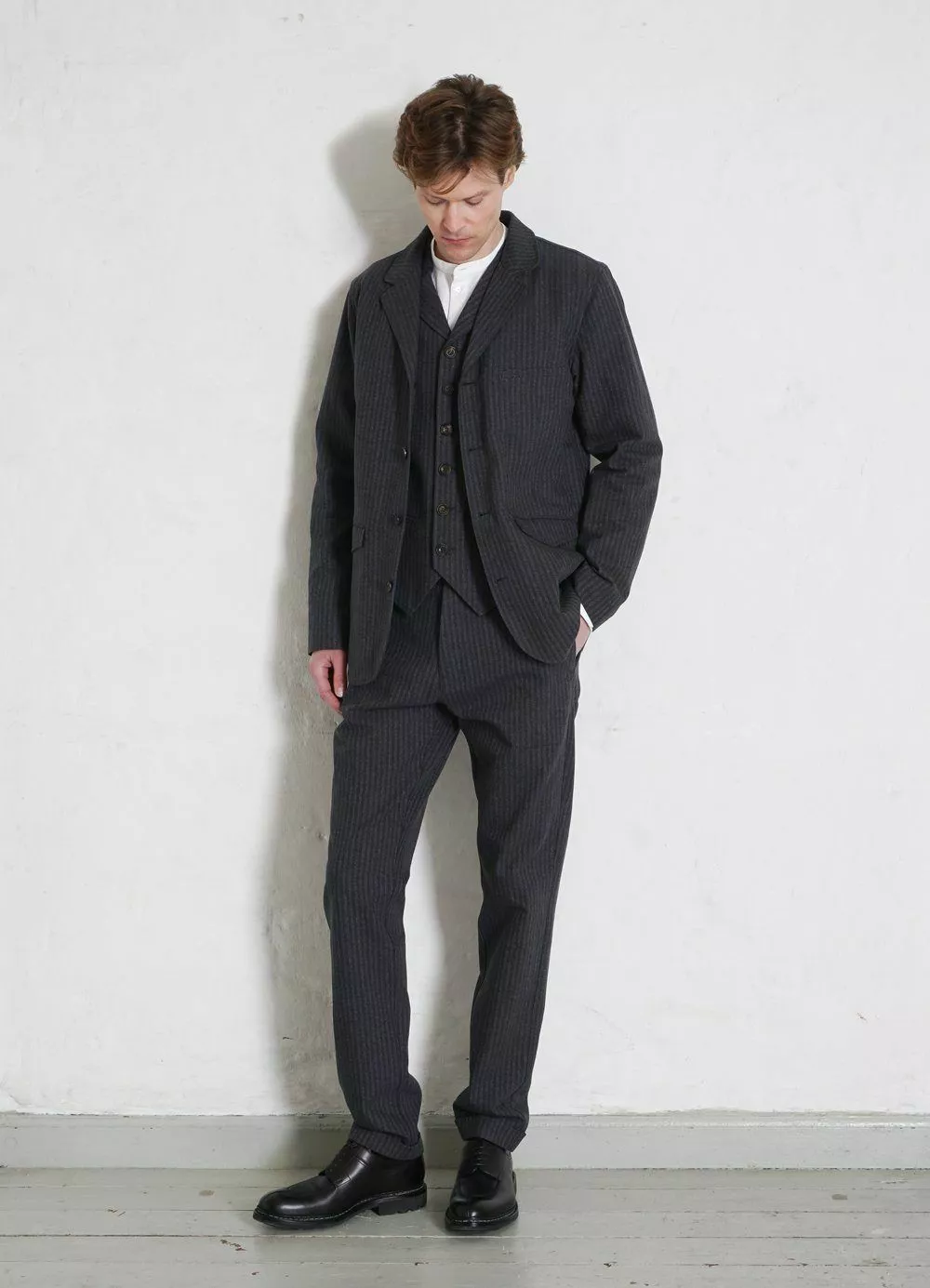 The fabric is a combination of a Herringbone weave and Pinstripes. It is made of 100% cotton with a pin striped pattern. It is classic and has strong traditions within men’s clothing with references to power and wealth. Pin stripes origins from uniforms worn by those who worked in banks, for the purpose of easily being recognized and not mistaken for being robbers or other intruders.