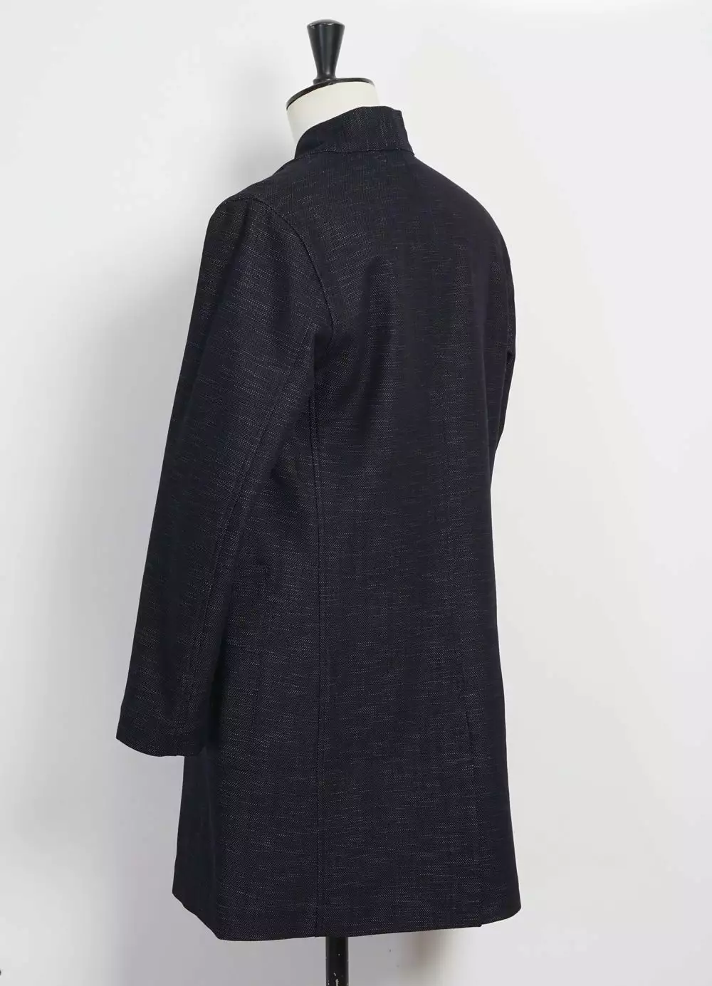 This yarn dyed Italian fabric is subtle yet intriguing due to the composition of cotton and silk, and slub yarns used. The slubs are made of silk and creates a structural surface with a denim like appearance.