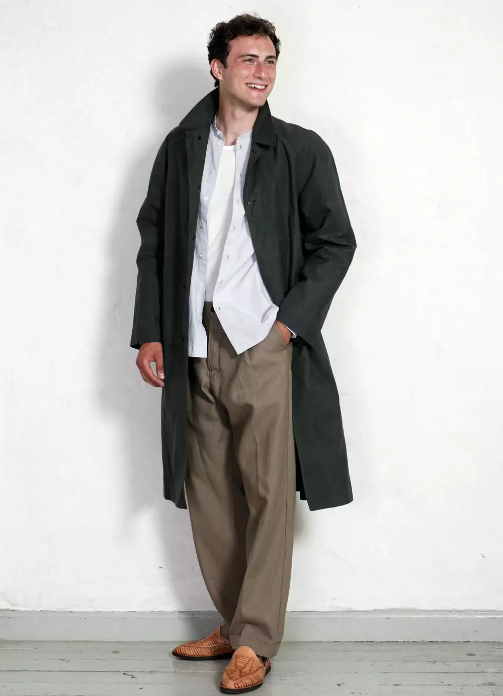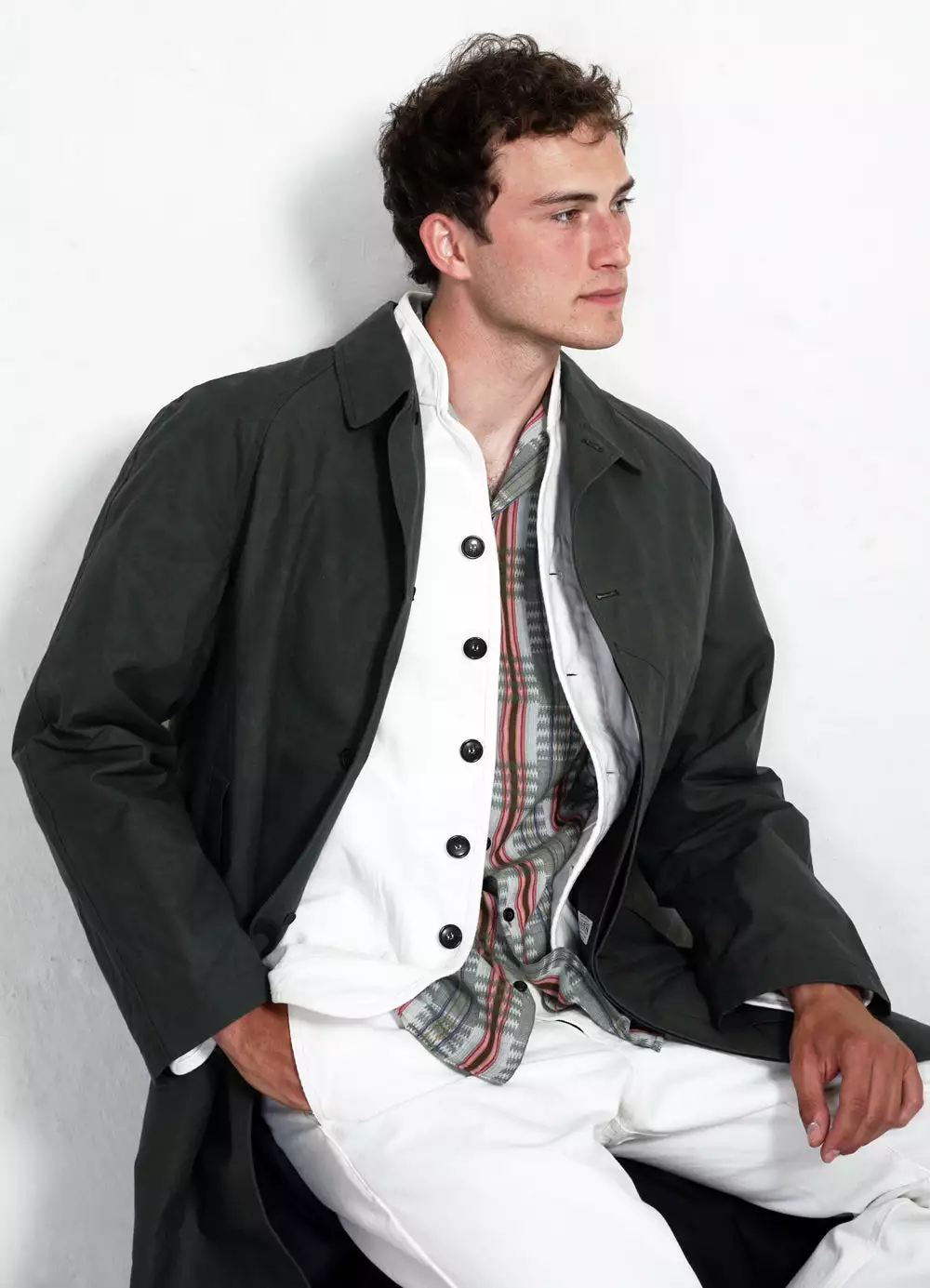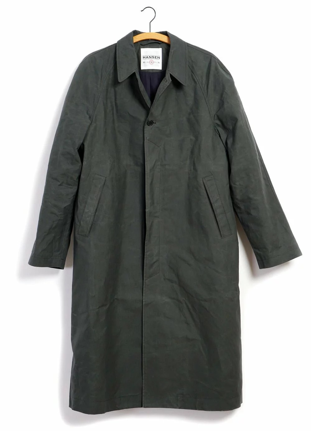 MORTEN is a long, regular fit, military inspired coat. It has slanted lower front pockets, raglan sleeves, a full cotton lining, a back slit, zipper inner pocket and real horn buttons.